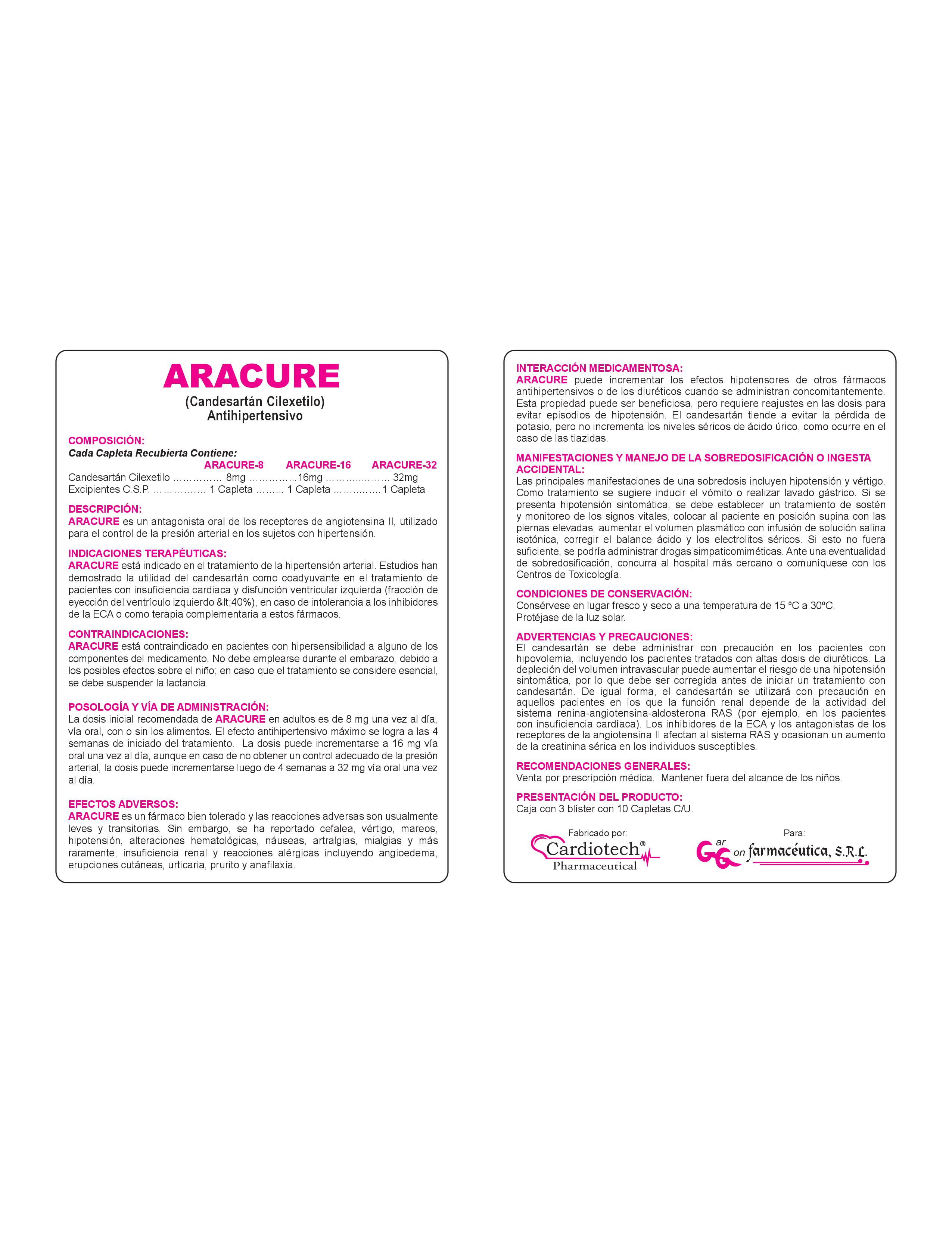 POSOLOGÍA Y VÍA DE ADMINISTRACIÓN: La dosis inicial recomendada de ARACURE en adultos es de 8 mg una vez al día, vía oral, con o sin los alimentos. El efecto antihipertensivo máximo se logra a las 4 semanas de iniciado del tratamiento. La dosis puede incrementarse a 16 mg vía oral una vez al día, aunque en caso de no obtener un control adecuado de la presión arterial, la dosis puede incrementarse luego de 4 semanas a 32 mg vía oral una vez al día.