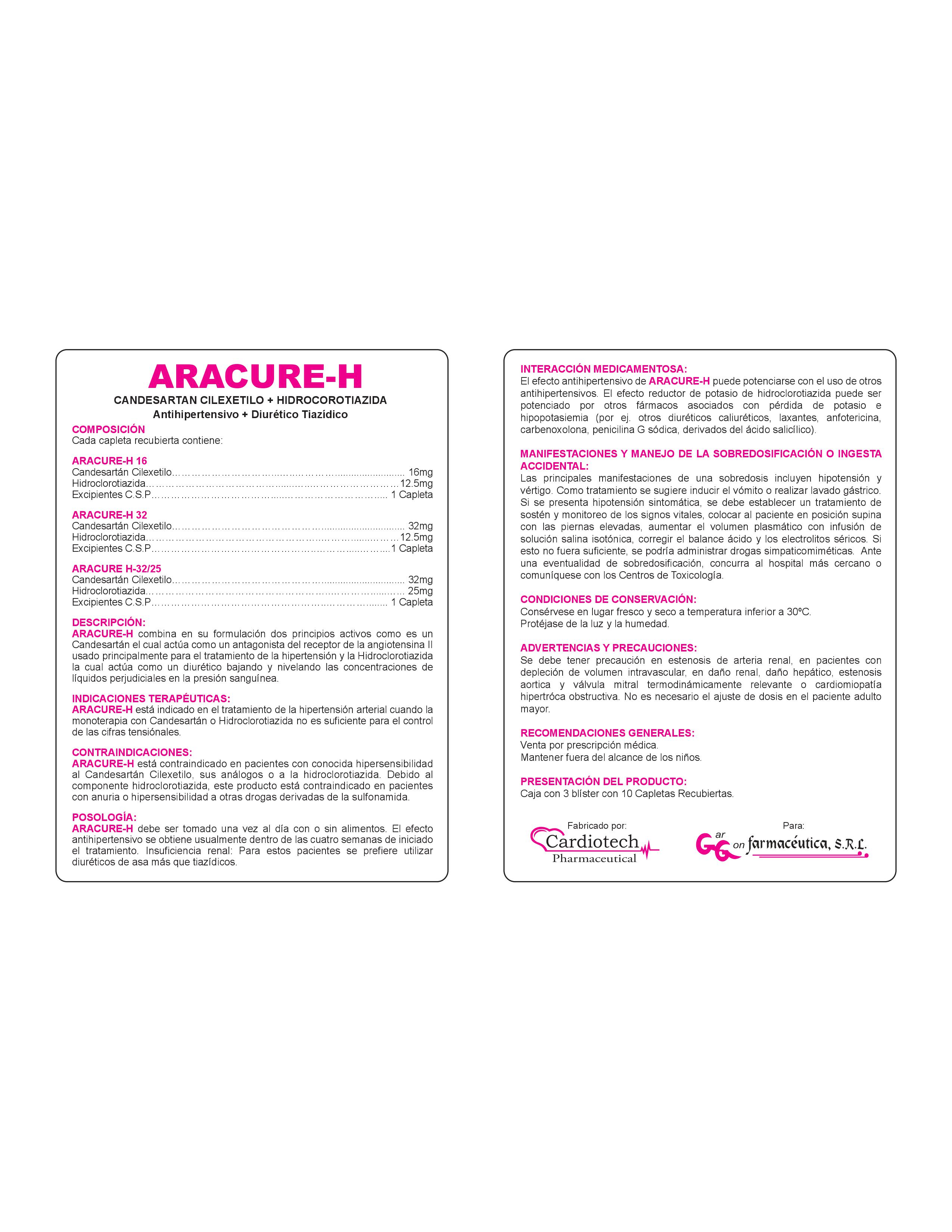 ARACURE H-32/25 Candesartán Cilexetilo……............................ 32mg Hidroclorotiazida………………………………………………..…………......…... 25mg Excipientes C.S.P……………………………………………..…………........ 1 Capleta