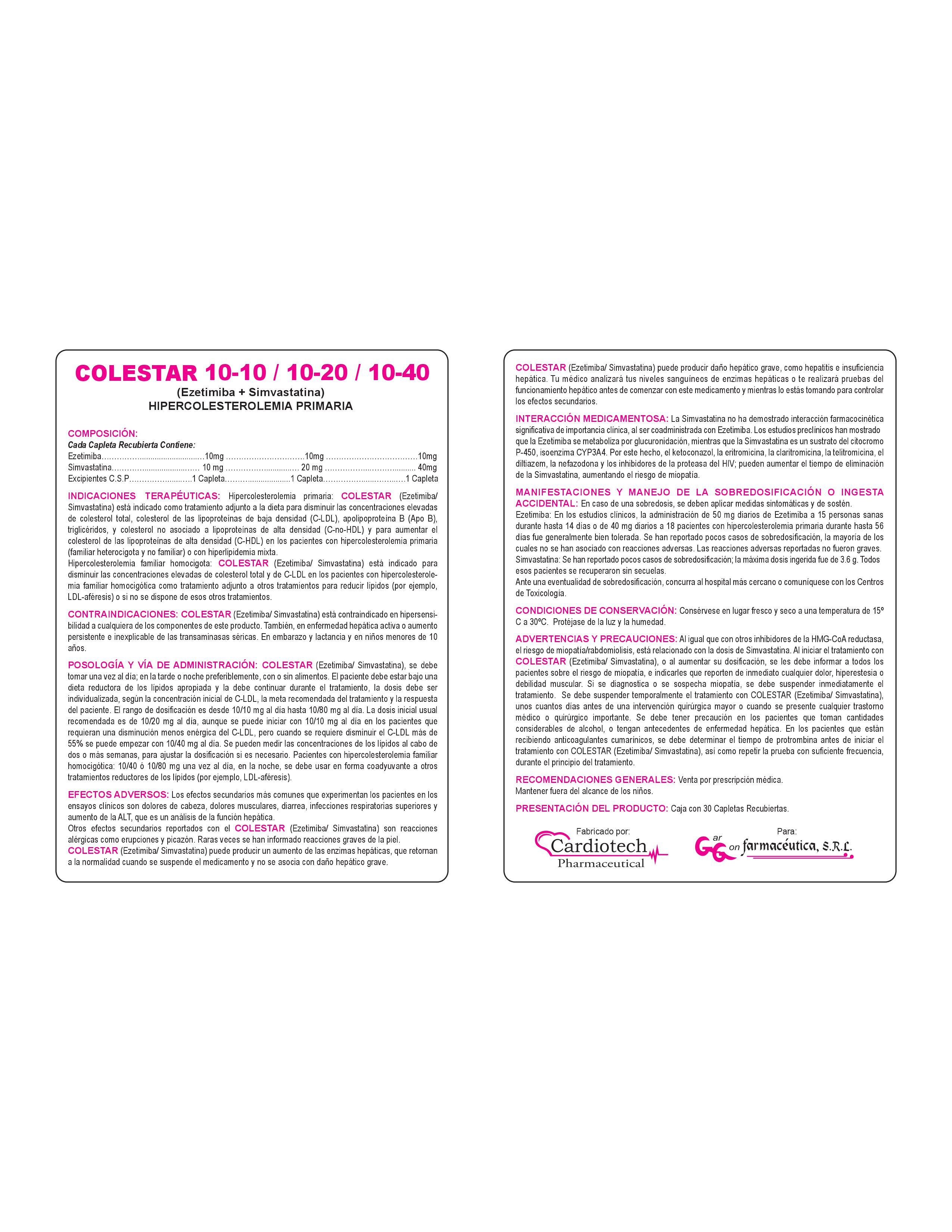POSOLOGÍA Y VÍA DE ADMINISTRACIÓN: COLESTAR (Ezetimiba/ Simvastatina), se debe tomar una vez al día; en la tarde o noche preferiblemente, con o sin alimentos. El paciente debe estar bajo una dieta reductora de los lípidos apropiada y la debe continuar durante el tratamiento, la dosis debe ser individualizada, según la concentración inicial de C-LDL, la meta recomendada del tratamiento y la respuesta del paciente. El rango de dosificación es desde 10/10 mg al día hasta 10/80 mg al día. La dosis inicial usual recomendada es de 10/20 mg al día, aunque se puede iniciar con 10/10 mg al día en los pacientes que requieran una disminución menos enérgica del C-LDL, pero cuando se requiere disminuir el C-LDL más de 55% se puede empezar con 10/40 mg al día. Se pueden medir las concentraciones de los lípidos al cabo de dos o más semanas, para ajustar la dosificación si es necesario. Pacientes con hipercolesterolemia familiar homocigótica: 10/40 ó 10/80 mg una vez al día, en la noche, se debe usar en forma coadyuvante a otros tratamientos reductores de los lípidos (por ejemplo, LDL-aféresis).