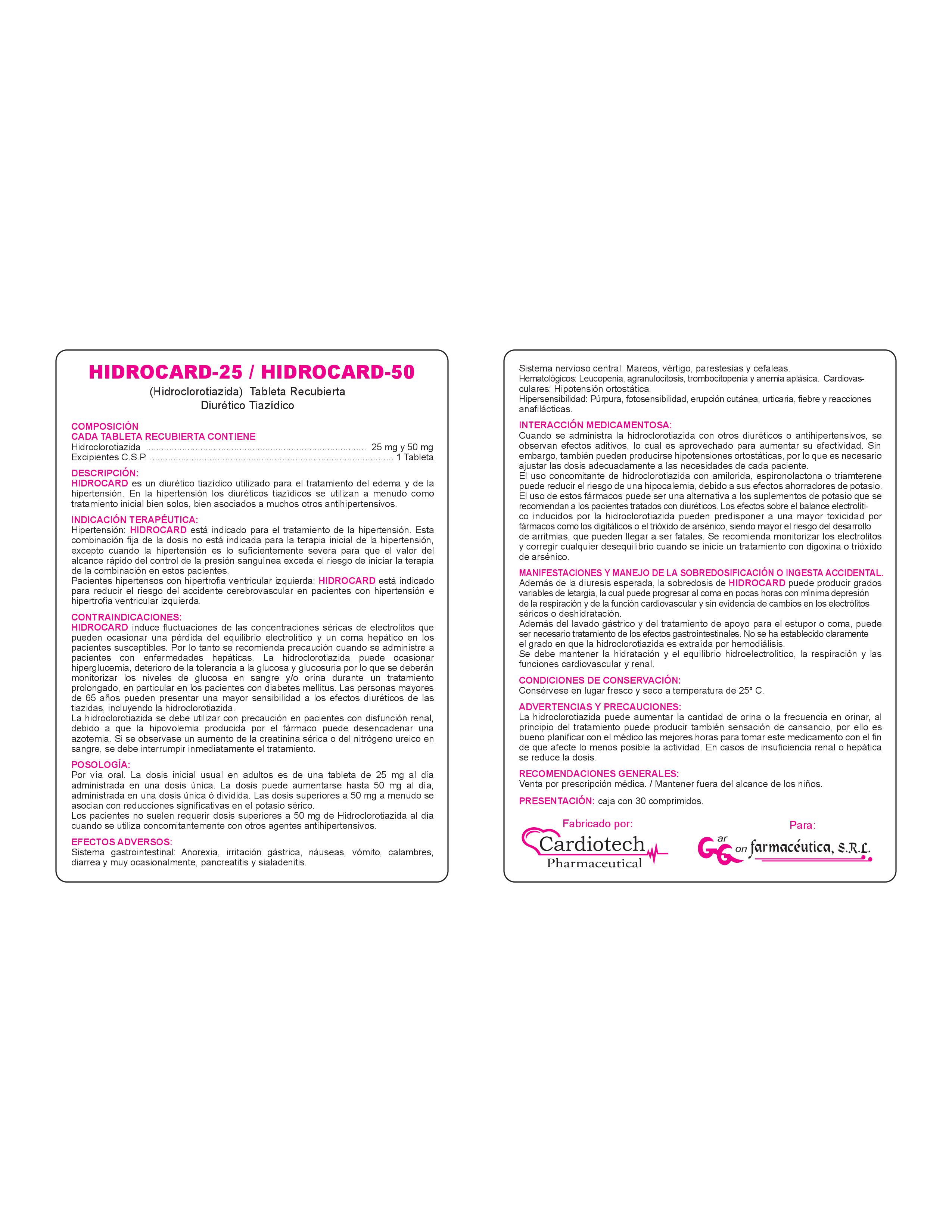 DESCRIPCIÓN: HIDROCARD es un diurético tiazídico utilizado para el tratamiento del edema y de la hipertensión. En la hipertensión los diuréticos tiazídicos se utilizan a menudo como tratamiento inicial bien solos, bien asociados a muchos otros antihipertensivos.