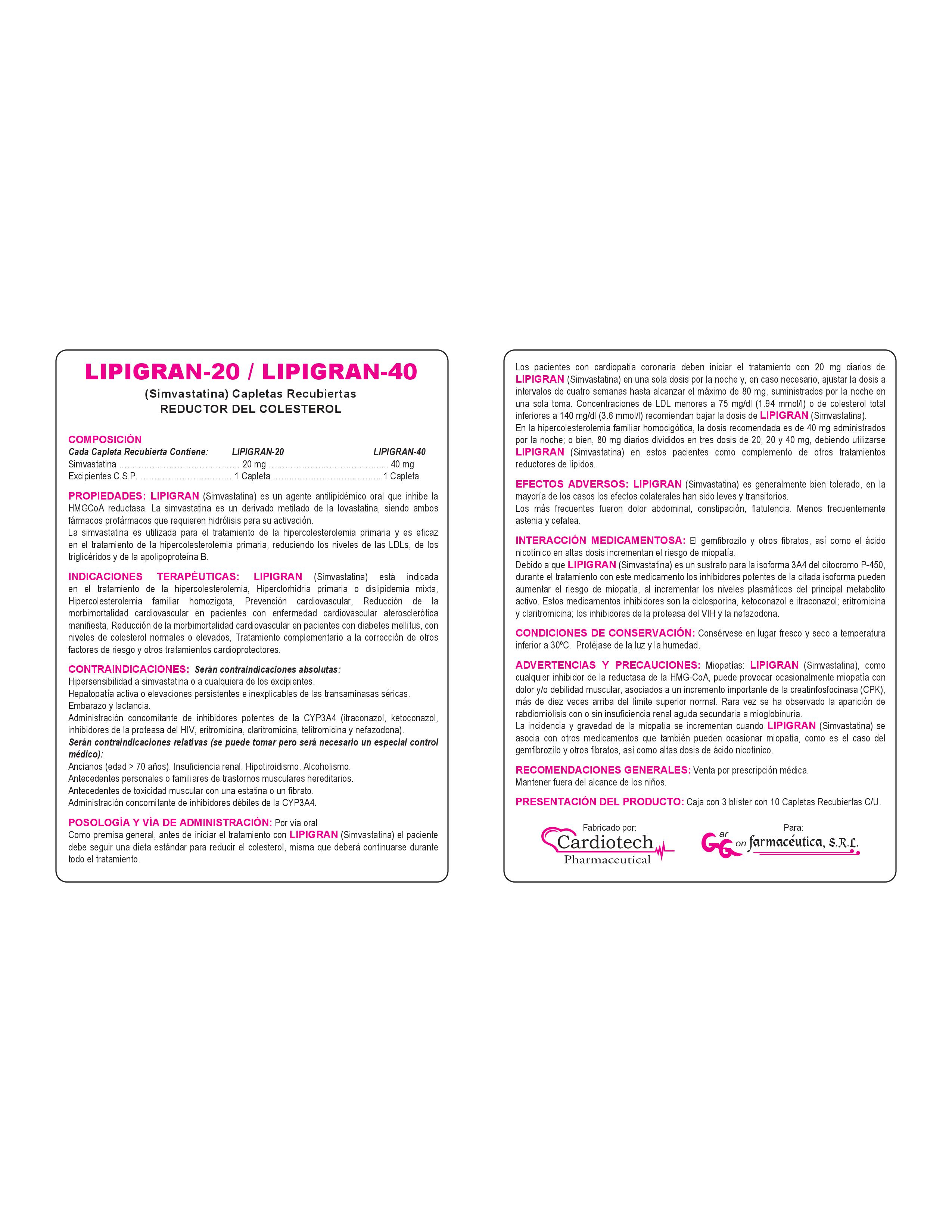 PROPIEDADES: LIPIGRAN (Simvastatina) es un agente antilipidémico oral que inhibe la HMGCoA reductasa. La simvastatina es un derivado metilado de la lovastatina, siendo ambos fármacos profármacos que requieren hidrólisis para su activación. La simvastatina es utilizada para el tratamiento de la hipercolesterolemia primaria y es eficaz en el tratamiento de la hipercolesterolemia primaria, reduciendo los niveles de las LDLs, de los triglicéridos y de la apolipoproteína B.