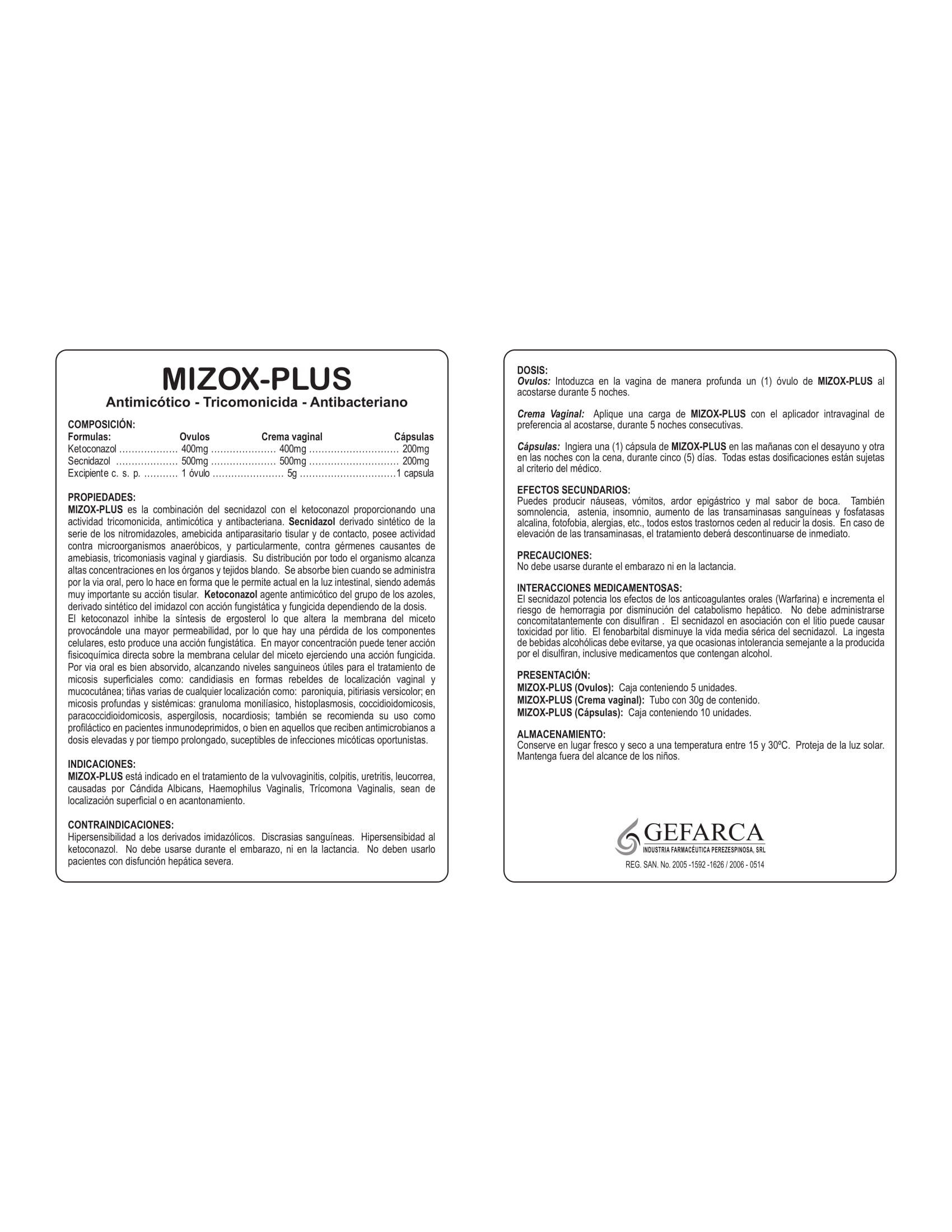 PROPIEDADES: MIZOX-PLUS es la combinación del secnidazol con el ketoconazol proporcionando una actividad tricomonicida, antimicótica y antibacteriana. Secnidazol derivado sintético de la serie de los nitromidazoles, amebicida antiparasitario tisular y de contacto, posee actividad contra microorganismos anaeróbicos, y particularmente, contra gérmenes causantes de amebiasis, tricomoniasis vaginal y giardiasis. Su distribución por todo el organismo alcanza altas concentraciones en los órganos y tejidos blandos. Se absorbe bien cuando se administra por la vía oral, pero lo hace en forma que le permite actuar en la luz intestinal, siendo además muy importante su acción tisular. Ketoconazol agente antimicótico del grupo de los azoles, derivado sintético del imidazol con acción fungistática y fungicida dependiendo de la dosis. El ketoconazol inhibe la síntesis de ergosterol lo que altera la membrana del miceto provocándole una mayor permeabilidad, por lo que hay una pérdida de los componentes celulares, esto produce una acción fungistática. En mayor concentración puede tener acción fisicoquímica directa sobre la membrana celular del miceto ejerciendo una acción fungicida. Por vía oral es bien absorbido, alcanzando niveles sanguíneos útiles para el tratamiento de micosis superficiales como: candidiasis en formas rebeldes de localización vaginal y mucocutánea; tiñas varias de cualquier localización como: paroniquia, pitiriasis versicolor; en micosis profundas y sistémicas: granuloma monilíasico, histoplasmosis, coccidioidomicosis, paracoccidioidomicosis, aspergilosis, nocardiosis; también se recomienda su uso como profiláctico en pacientes inmunodeprimidos, o bien en aquellos que reciben antimicrobianos a dosis elevadas y por tiempo prolongado, susceptibles de infecciones micóticas oportunistas.