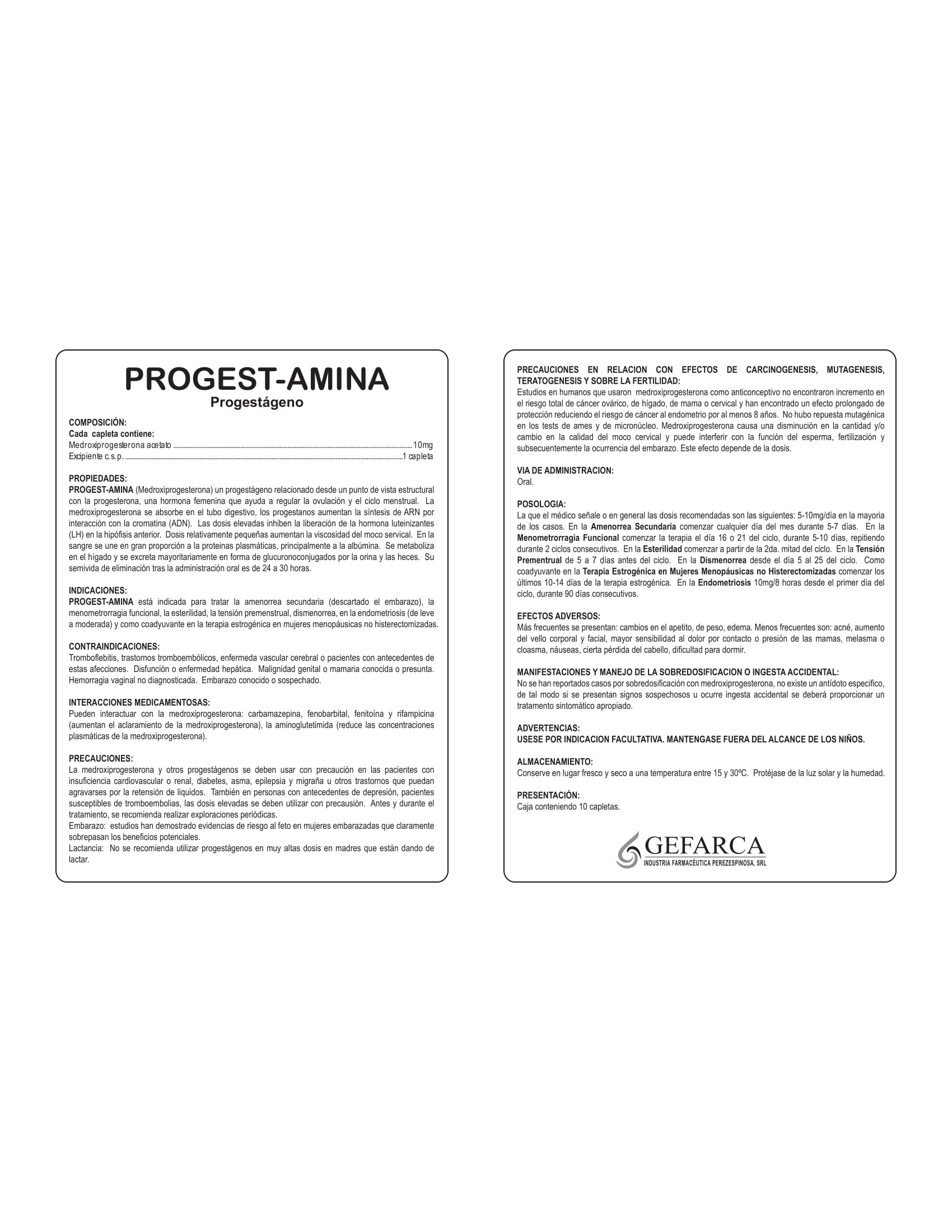 PROPIEDADES: PROGEST-AMINA (Medroxiprogesterona) un progestágeno relacionado desde un punto de vista estructural con la progesterona, una hormona femenina que ayuda a regular la ovulación y el ciclo menstrual. La medroxiprogesterona se absorbe en el tubo digestivo, los progestános aumentan la síntesis de ARN por interacción con la cromatina (ADN). Las dosis elevadas inhiben la liberación de la hormona luteinizantes (LH) en la hipófisis anterior. Dosis relativamente pequeñas aumentan la viscosidad del moco cervical. En la sangre se une en gran proporción a las proteínas plasmáticas, principalmente a la albúmina. Se metaboliza en el hígado y se excreta mayoritariamente en forma de glucuronoconjugados por la orina y las heces. Su semivida de eliminación tras la administración oral es de 24 a 30 horas.